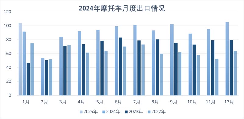 1月,我國摩托車外貿出口延續上一年的增長態勢,出口量持續穩居高位水平,與去年同期相比,增長明顯。250ml以上大排量摩托車的出口實現了大幅度增長,出口產品結構持續優化,我國摩托車產品的國際競爭力進一步提高。
