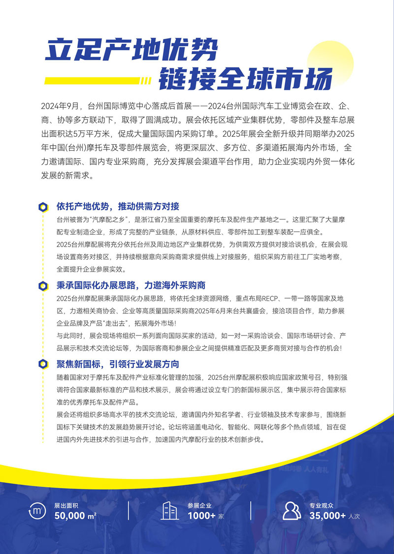 2024年9月,臺州國際博覽中心落成后首展——2024臺州國際汽車工業(yè)博覽會在政、企、商、協(xié)等多方聯(lián)動下,取得了圓滿成功。展會依托區(qū)域產(chǎn)業(yè)集群優(yōu)勢,零部件及整車總展 出面積達(dá)5萬平方米,促成大量國際國內(nèi)采購訂單。2025年展會全新升級并同期舉辦2025 年中國(臺州)摩托車及零部件展覽會,將更深層次、多方位、多渠道拓展海內(nèi)外市場,全力邀請國際、國內(nèi)專業(yè)采購商,充分發(fā)揮展會渠道平臺作用,助力企業(yè)實(shí)現(xiàn)內(nèi)外貿(mào)一體化發(fā)展的新需求。