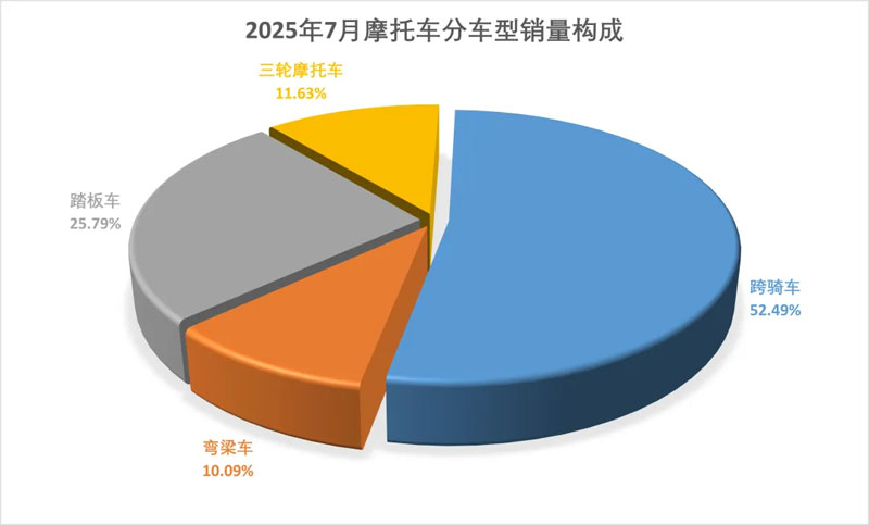 1-7月,跨騎車產(chǎn)銷657.24萬輛和656.12萬輛,同比增長18.17%和18.41%;踏板車產(chǎn)銷322.53萬和322.37萬輛,同比下降5.23%和6.98%;彎梁車產(chǎn)銷124.68萬輛和126.14萬輛,同比增長27.60%和32.01%。從各車型銷量占二輪車總銷量的比重看,跨騎、踏板和彎梁三類車型占比分別為59.40%、29.18%和11.42%。