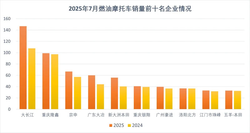 1-7月,燃油摩托車銷量前十名企業(yè)(集團)為大長江、隆鑫、宗申、廣東大冶、新大洲本田、重慶銀翔、廣州豪進、洛陽北方、江門珠峰、五羊-本田,分別銷售145.94萬輛、98.53萬輛、64.81萬輛、60.42萬輛、56.43萬輛、40.65萬輛、39.19萬輛、36.97萬輛、33.90萬輛和32.90萬輛。35.31萬輛、33.16萬輛、31.74萬輛、28.71萬輛和27.28萬輛。