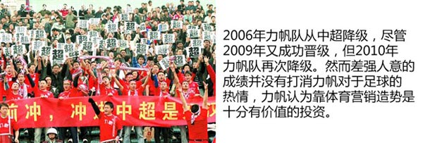 為了提升品牌知名度,力帆在營銷上頗費了一番心機。尹明善說:“足球是個打造品牌的最好載體,中國有3億球迷,全世界有10億球迷,進入足球界,就意味著在眾多球迷中引起品牌效應(yīng)。”2000年8月,力帆用5580萬元收購了重慶前衛(wèi)寰島足球俱樂部,并更名為重慶力帆足球俱樂部。然而,在隨后幾年中,力帆隊一直掙扎在甲A中下游,并在2003年慘遭降級,無緣中超。