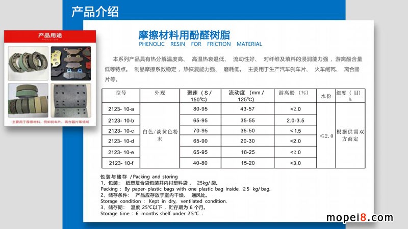 任縣成豐樹脂廠專業(yè)生產(chǎn)摩擦材料(剎車片、離合器片)專用酚醛樹脂。本產(chǎn)品具有熱分解溫度高、高溫?zé)崴ネ说汀⒘鲃有院谩w維及填料的浸潤能力強,游離酚含量低等特點。制品摩擦系數(shù)穩(wěn)定,熱恢復(fù)能力強、磨耗低。主要用于生產(chǎn)各種汽車剎車片、摩托車剎車片、火車閘瓦、離合器片等。歡迎咨詢洽談合作!