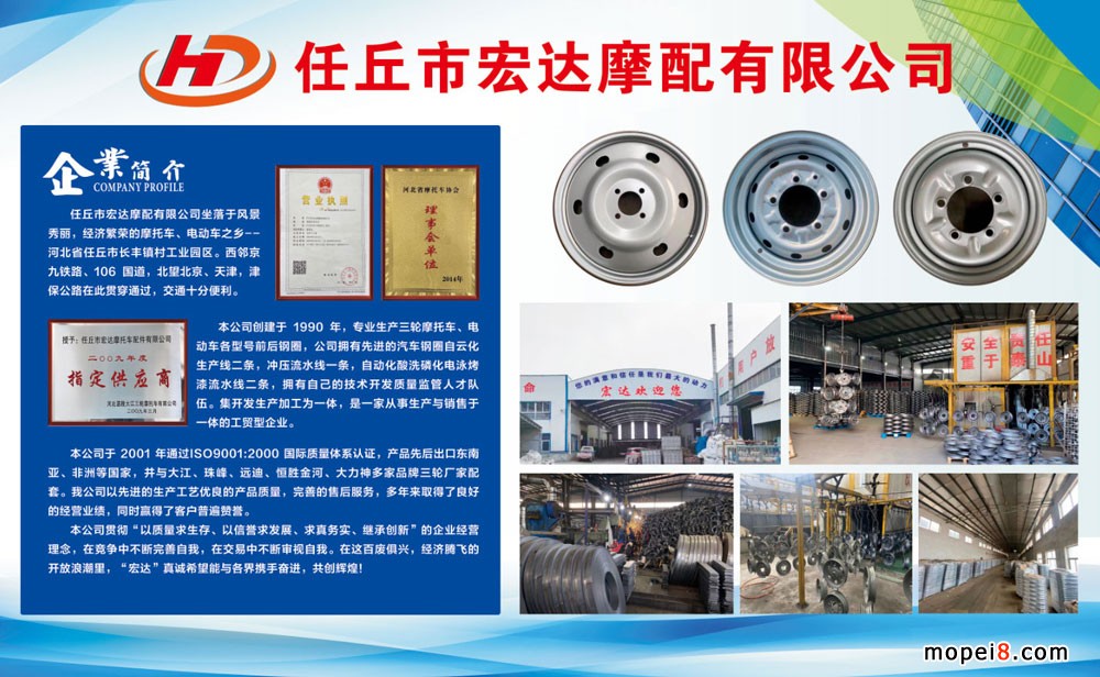 任丘市宏達摩配有限公司專業生產電動三輪摩托車鋼圈,公司具有先進的生產設備,雄厚的技術力量,多條生產流水線,電泳烤漆線。三十年老廠,資質齊全,質量穩定,隨時歡迎各位朋友來廠指導!期待與每一位客戶合作共贏!