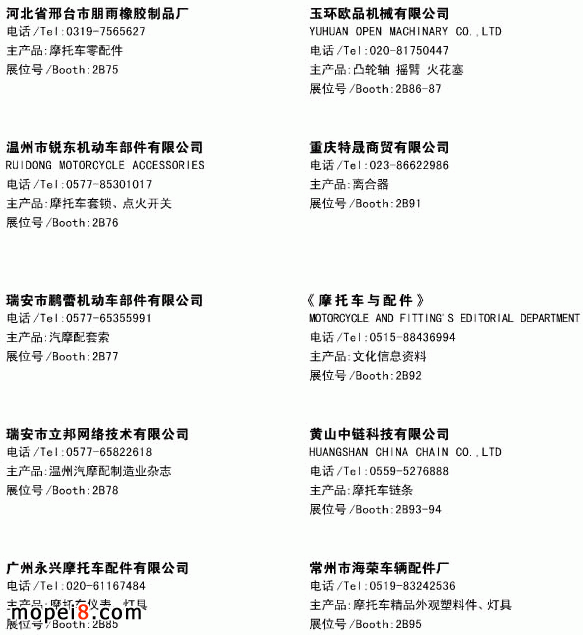 第三十三屆(2013春)全國摩托車及配件展示交易會已于2013年4月25日在濟南國際會展中心召開,2013春季全國摩配會已過去一個月了,仍有一些摩配同仁問到關于此次的展會情況及參展企業的信息,為方便需要了解此次展會信息的同仁,現將參展企業的主營產品及聯系電話發布出來。