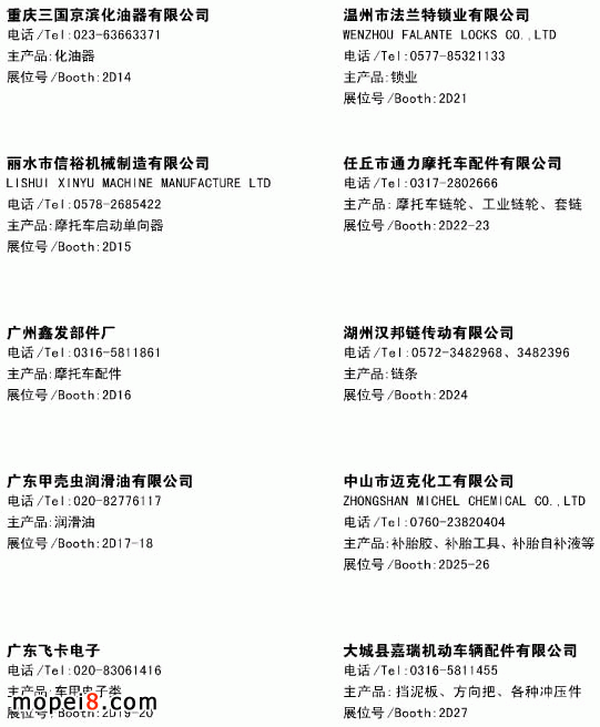 第三十三屆(2013春)全國摩托車及配件展示交易會已于2013年4月25日在濟南國際會展中心召開,2013春季全國摩配會已過去一個月了,仍有一些摩配同仁問到關于此次的展會情況及參展企業的信息,為方便需要了解此次展會信息的同仁,現將參展企業的主營產品及聯系電話發布出來。