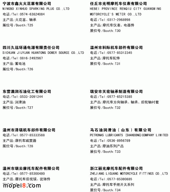 第三十三屆(2013春)全國摩托車及配件展示交易會(huì)已于2013年4月25日在濟(jì)南國際會(huì)展中心召開,2013春季全國摩配會(huì)已過去一個(gè)月了,仍有一些摩配同仁問到關(guān)于此次的展會(huì)情況及參展企業(yè)的信息,為方便需要了解此次展會(huì)信息的同仁,現(xiàn)將參展企業(yè)的主營(yíng)產(chǎn)品及聯(lián)系電話發(fā)布出來。