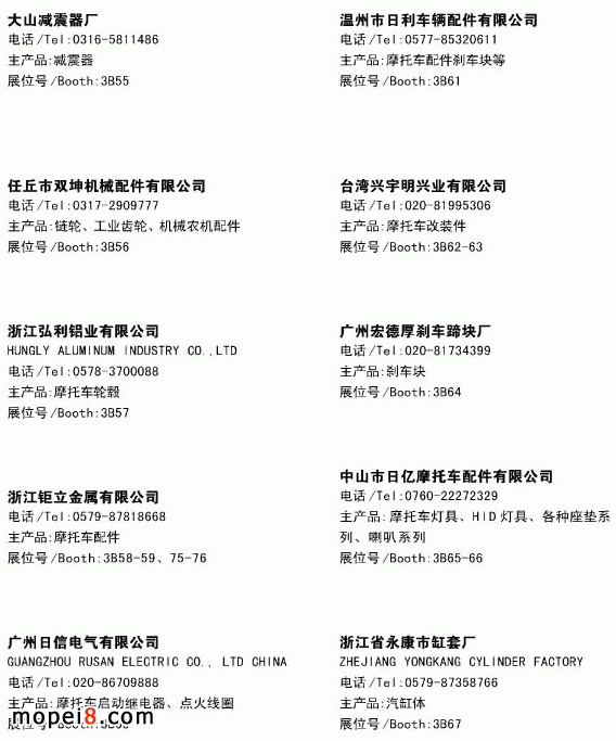 第三十三屆(2013春)全國摩托車及配件展示交易會已于2013年4月25日在濟南國際會展中心召開,2013春季全國摩配會已過去一個月了,仍有一些摩配同仁問到關于此次的展會情況及參展企業的信息,為方便需要了解此次展會信息的同仁,現將參展企業的主營產品及聯系電話發布出來。
