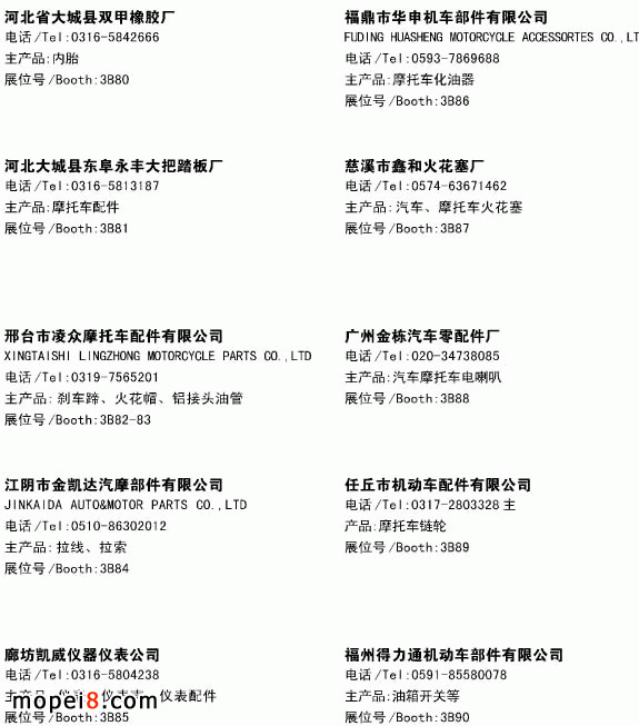 第三十三屆(2013春)全國摩托車及配件展示交易會已于2013年4月25日在濟南國際會展中心召開,2013春季全國摩配會已過去一個月了,仍有一些摩配同仁問到關于此次的展會情況及參展企業的信息,為方便需要了解此次展會信息的同仁,現將參展企業的主營產品及聯系電話發布出來。
