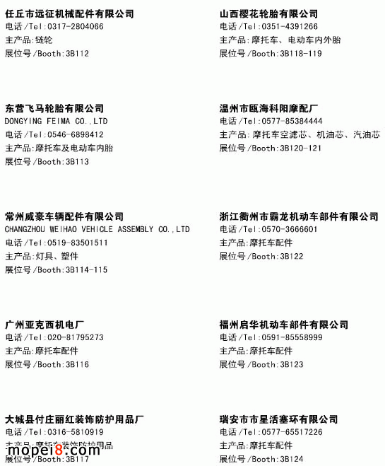 第三十三屆(2013春)全國(guó)摩托車(chē)及配件展示交易會(huì)已于2013年4月25日在濟(jì)南國(guó)際會(huì)展中心召開(kāi),2013春季全國(guó)摩配會(huì)已過(guò)去一個(gè)月了,仍有一些摩配同仁問(wèn)到關(guān)于此次的展會(huì)情況及參展企業(yè)的信息,為方便需要了解此次展會(huì)信息的同仁,現(xiàn)將參展企業(yè)的主營(yíng)產(chǎn)品及聯(lián)系電話發(fā)布出來(lái)。