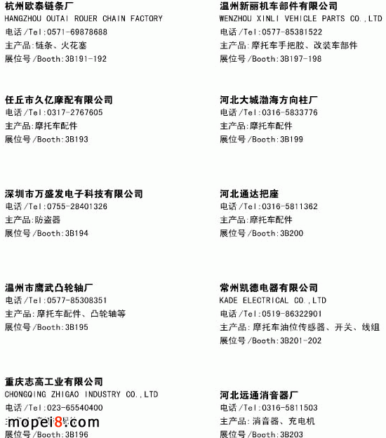 第三十三屆(2013春)全國摩托車及配件展示交易會已于2013年4月25日在濟南國際會展中心召開,2013春季全國摩配會已過去一個月了,仍有一些摩配同仁問到關于此次的展會情況及參展企業的信息,為方便需要了解此次展會信息的同仁,現將參展企業的主營產品及聯系電話發布出來。