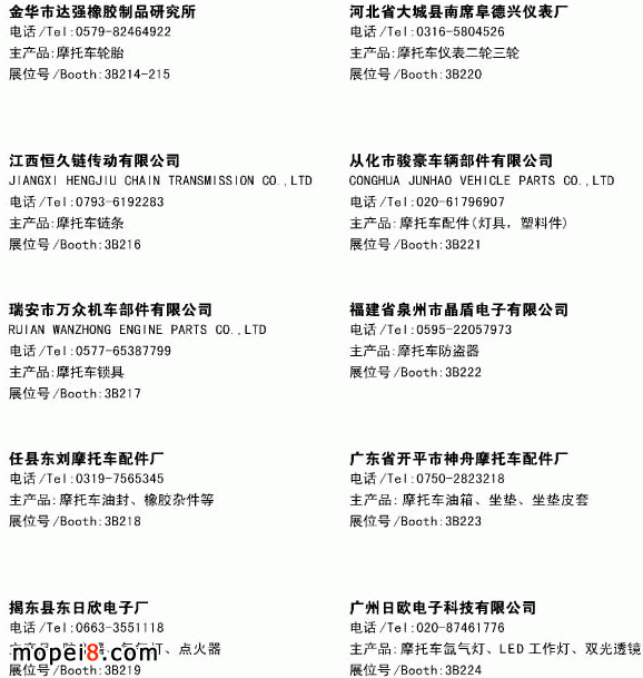 第三十三屆(2013春)全國摩托車及配件展示交易會已于2013年4月25日在濟南國際會展中心召開,2013春季全國摩配會已過去一個月了,仍有一些摩配同仁問到關于此次的展會情況及參展企業的信息,為方便需要了解此次展會信息的同仁,現將參展企業的主營產品及聯系電話發布出來。