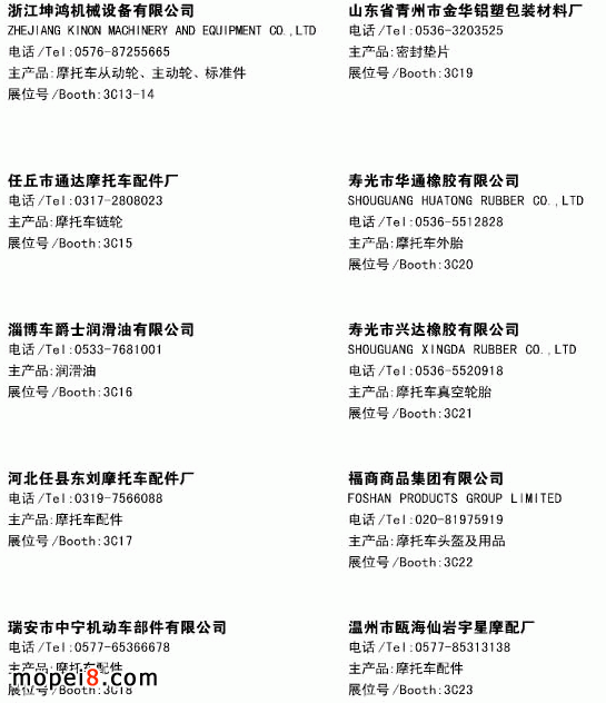 第三十三屆(2013春)全國摩托車及配件展示交易會已于2013年4月25日在濟南國際會展中心召開,2013春季全國摩配會已過去一個月了,仍有一些摩配同仁問到關于此次的展會情況及參展企業的信息,為方便需要了解此次展會信息的同仁,現將參展企業的主營產品及聯系電話發布出來。