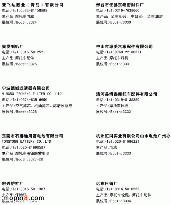 第三十三屆(2013春)全國摩托車及配件展示交易會已于2013年4月25日在濟南國際會展中心召開,2013春季全國摩配會已過去一個月了,仍有一些摩配同仁問到關于此次的展會情況及參展企業的信息,為方便需要了解此次展會信息的同仁,現將參展企業的主營產品及聯系電話發布出來。