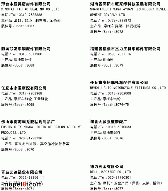 第三十三屆(2013春)全國摩托車及配件展示交易會已于2013年4月25日在濟南國際會展中心召開,2013春季全國摩配會已過去一個月了,仍有一些摩配同仁問到關于此次的展會情況及參展企業的信息,為方便需要了解此次展會信息的同仁,現將參展企業的主營產品及聯系電話發布出來。