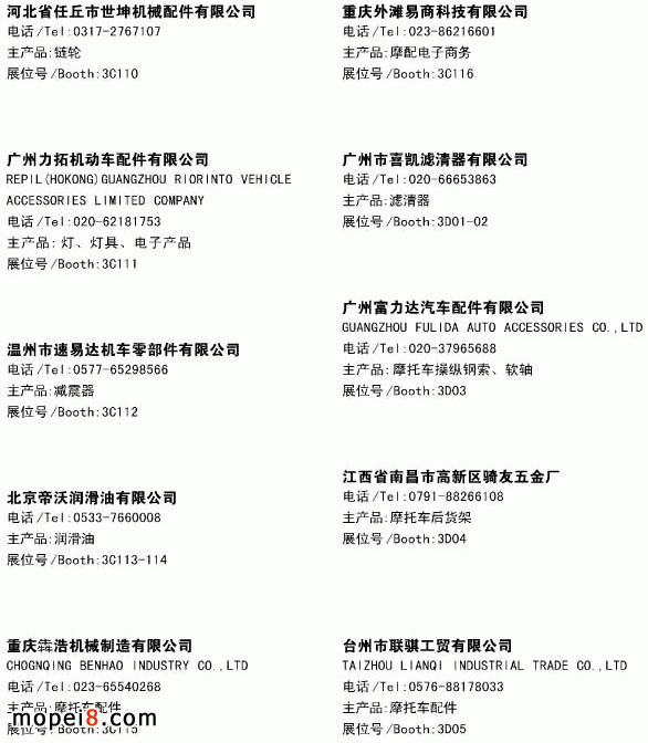第三十三屆(2013春)全國摩托車及配件展示交易會已于2013年4月25日在濟南國際會展中心召開,2013春季全國摩配會已過去一個月了,仍有一些摩配同仁問到關于此次的展會情況及參展企業的信息,為方便需要了解此次展會信息的同仁,現將參展企業的主營產品及聯系電話發布出來。
