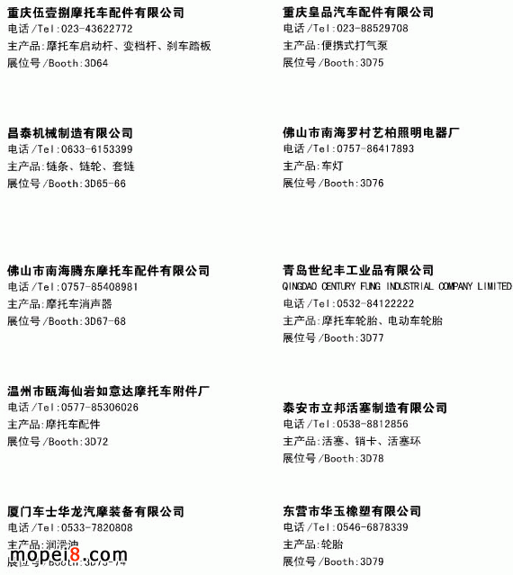 第三十三屆(2013春)全國摩托車及配件展示交易會已于2013年4月25日在濟南國際會展中心召開,2013春季全國摩配會已過去一個月了,仍有一些摩配同仁問到關(guān)于此次的展會情況及參展企業(yè)的信息,為方便需要了解此次展會信息的同仁,現(xiàn)將參展企業(yè)的主營產(chǎn)品及聯(lián)系電話發(fā)布出來。