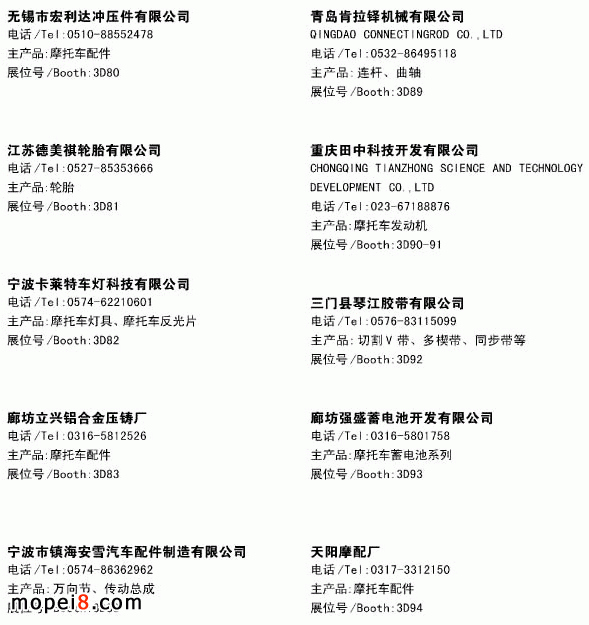 第三十三屆(2013春)全國摩托車及配件展示交易會已于2013年4月25日在濟南國際會展中心召開,2013春季全國摩配會已過去一個月了,仍有一些摩配同仁問到關于此次的展會情況及參展企業的信息,為方便需要了解此次展會信息的同仁,現將參展企業的主營產品及聯系電話發布出來。