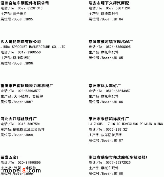 第三十三屆(2013春)全國摩托車及配件展示交易會已于2013年4月25日在濟南國際會展中心召開,2013春季全國摩配會已過去一個月了,仍有一些摩配同仁問到關于此次的展會情況及參展企業的信息,為方便需要了解此次展會信息的同仁,現將參展企業的主營產品及聯系電話發布出來。