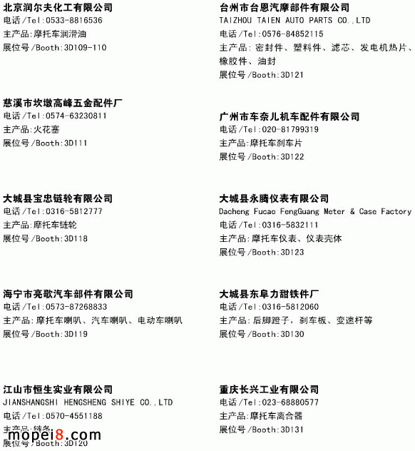 第三十三屆(2013春)全國摩托車及配件展示交易會已于2013年4月25日在濟(jì)南國際會展中心召開,2013春季全國摩配會已過去一個(gè)月了,仍有一些摩配同仁問到關(guān)于此次的展會情況及參展企業(yè)的信息,為方便需要了解此次展會信息的同仁,現(xiàn)將參展企業(yè)的主營產(chǎn)品及聯(lián)系電話發(fā)布出來。