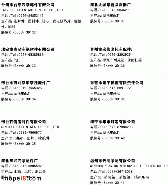 第三十三屆(2013春)全國摩托車及配件展示交易會已于2013年4月25日在濟南國際會展中心召開,2013春季全國摩配會已過去一個月了,仍有一些摩配同仁問到關于此次的展會情況及參展企業的信息,為方便需要了解此次展會信息的同仁,現將參展企業的主營產品及聯系電話發布出來。