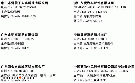 第三十三屆(2013春)全國(guó)摩托車(chē)及配件展示交易會(huì)已于2013年4月25日在濟(jì)南國(guó)際會(huì)展中心召開(kāi),2013春季全國(guó)摩配會(huì)已過(guò)去一個(gè)月了,仍有一些摩配同仁問(wèn)到關(guān)于此次的展會(huì)情況及參展企業(yè)的信息,為方便需要了解此次展會(huì)信息的同仁,現(xiàn)將參展企業(yè)的主營(yíng)產(chǎn)品及聯(lián)系電話發(fā)布出來(lái)。