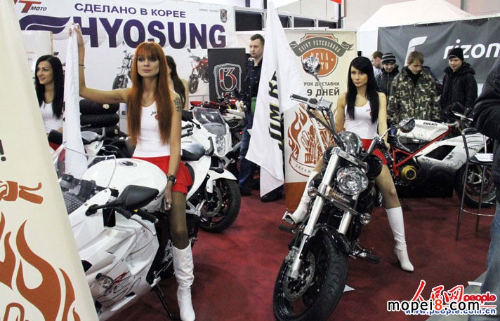 每一場汽車展覽會都少不了美女模特的參與和陪襯,摩托車展也是如此。在4月1日閉幕的2012年俄羅斯第九屆國際摩托車及零配件展上,眾多金發長腿美女現身,成為展覽上一道亮麗的風景線。(環球網)