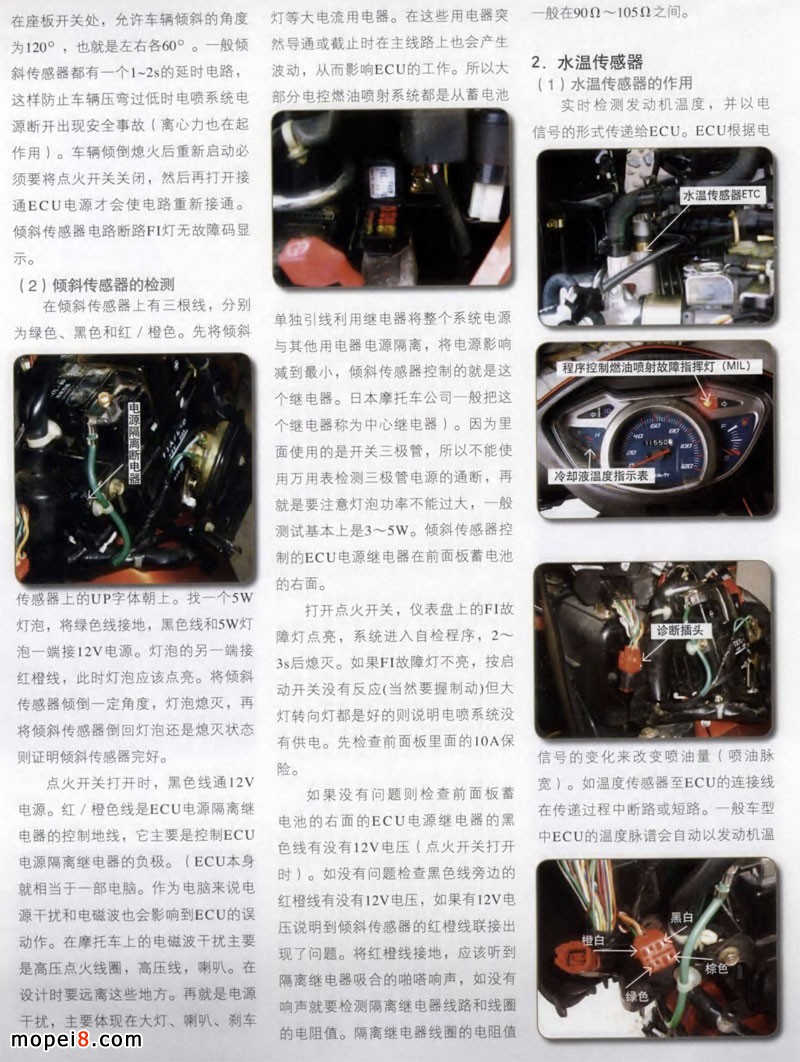 電噴摩托車上的傳感器主要有三合一傳感器(進氣溫度、節(jié)氣閥位置、進氣壓力)、傾斜傳感器、水溫傳感器、曲軸相位傳感器和氧傳感器等,電噴摩托車的主要控制器是電控單元(ECU),為了使摩托車正常運轉(zhuǎn),電噴摩托車上還安裝有執(zhí)行器,執(zhí)行器主要有汽油泵、噴油器、怠速控制閥、曲軸箱強制通風(fēng)電磁閥、以及高壓點火線圈、故障顯示燈等。下面我們對電噴摩托車上的這些裝置的作用及檢測作一簡單的介紹。