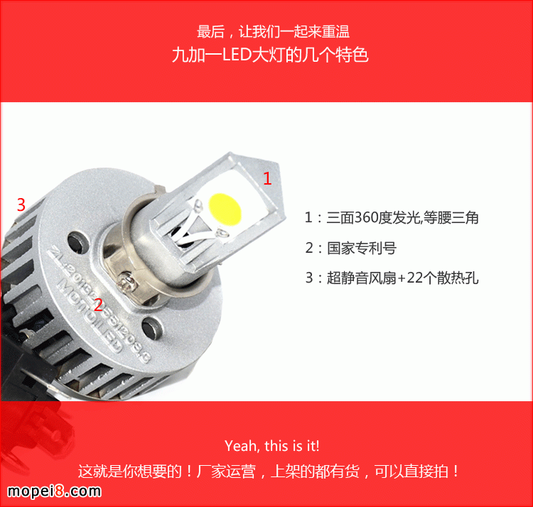 1.九加一專利產(chǎn)品,專利號:ZL:201320551208.3,三面360度發(fā)光,配合原車燈杯反射,光利用率提升30%,瞬間啟動,從根本解決燈光盲區(qū)。特殊材質(zhì),解決高溫散熱問題。