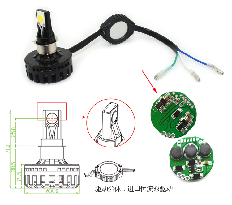8.本燈為直流供電,用在直流摩托車或大燈端電壓為12V的電動車上;如果是交流車,或者大燈端電壓高于12V的電動車就不能用。