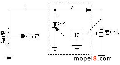 當(dāng)磁電機(jī)輸出電壓在正半周時(shí),電壓瞬時(shí)值超過蓄電池電壓,電流流經(jīng)1通過2直通二極管,而IC(充電電流控制裝置)發(fā)送信號(hào)使可控硅SCR阻止電流從3流過4處。這樣蓄電池就直接充電。當(dāng)輸出電壓增大時(shí),IC發(fā)出信號(hào),使可控硅SCR的導(dǎo)通角減少,從而控制了充電的電流,有效地防止了蓄電池過度充電。
