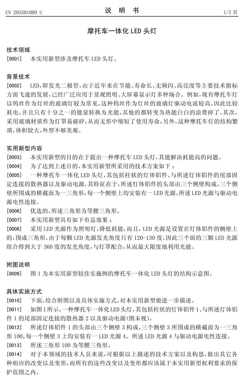 簡(jiǎn)要說明: 本實(shí)用新型涉及摩托車一體化LED頭燈,其包括柱狀的燈體鋁件、與所述燈體鋁件的尾部固定連接的散熱器以及驅(qū)動(dòng)電源,其特征在于,所述燈體鋁件的頭部由三個(gè)側(cè)壁構(gòu)成,三個(gè)側(cè)壁所圍成的橫截面為一三角形,每一個(gè)側(cè)壁上均安裝有一LED光源,所述LED光源與驅(qū)動(dòng)電源電性連接。本實(shí)用新型采用LED作為光源,降低耗能,而且,LED光源是設(shè)置在燈體鋁件的側(cè)壁上的,圍成三角形,由于每顆LED光源發(fā)光角度只有120-130度,因此三個(gè)面的三顆LED光源組合得到大于360度的發(fā)光角度,與燈罩配合,從而最大限度地利用光能。 |