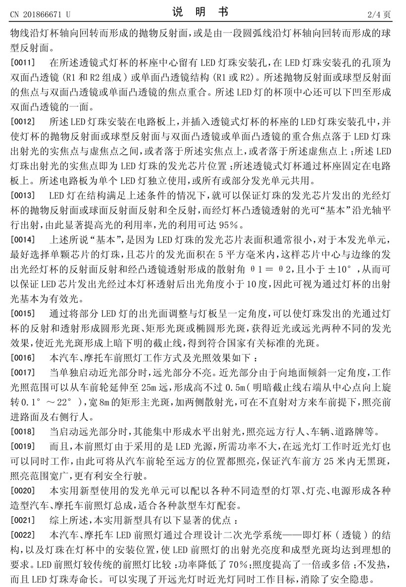 簡要說明: 本實用新型提出一種汽車、摩托車LED前照燈,其包括LED燈、燈板、燈座、燈片和后殼和透明外罩。燈板上并列布置有至少三個所述的LED燈,其中至少有一個LED燈的出射光線與燈板平面的垂直線之間呈0.5°~22°夾角,且與燈板平面的垂直線呈所述夾角的LED燈中,至少有一個LED燈的杯頂表面為豎直排列的柱面形式,形成前照燈的近光部分。燈架上其余的LED燈的杯頂表面為平面,同時,至少有一個LED燈的出射光線與燈板平面的垂直線重合,形成前照燈的遠(yuǎn)光部分。本前照燈通過合理設(shè)計二次光學(xué)系統(tǒng)使LED前照燈的出射光亮度和成型光斑均達(dá)到理想的要求,消除安全隱患,并可降低功率,提高照度,不發(fā)熱,壽命長。 |