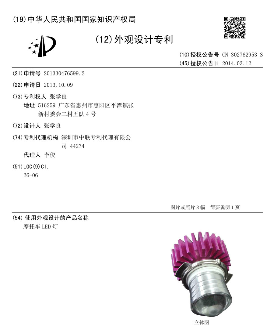 簡(jiǎn)要說(shuō)明: 1.本外觀設(shè)計(jì)產(chǎn)品的名稱(chēng):摩托車(chē)LED燈。2.本外觀設(shè)計(jì)產(chǎn)品的用途:本外觀設(shè)計(jì)產(chǎn)品用于照明。3.本外觀設(shè)計(jì)產(chǎn)品的設(shè)計(jì)要點(diǎn):在于產(chǎn)品的整個(gè)設(shè)計(jì)。4.最能表明本外觀設(shè)計(jì)設(shè)計(jì)要點(diǎn)的圖片或照片:立體圖。 |