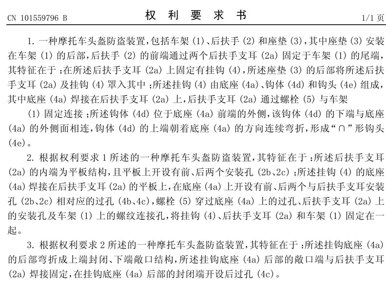 簡要說明: 本發明公開了一種摩托車頭盔防盜裝置,包括車架(1)、后扶手(2)和座墊(3),其中座墊(3)安裝在車架(1)的后部,后扶手(2)的前端通過兩個后扶手支耳(2a)固定于車架(1)的尾端,在所述后扶手支耳(2a)上固定有掛鉤(4),所述座墊(3)的后部將所述后扶手支耳(2a)及掛鉤(4)罩入其中。本發明在不占用置物箱空間的前提下,能方便摩托車頭盔及其它物品的臨時掛放,并且防盜效果良好,具有構思巧妙、結構簡單、實施容易等特點。
