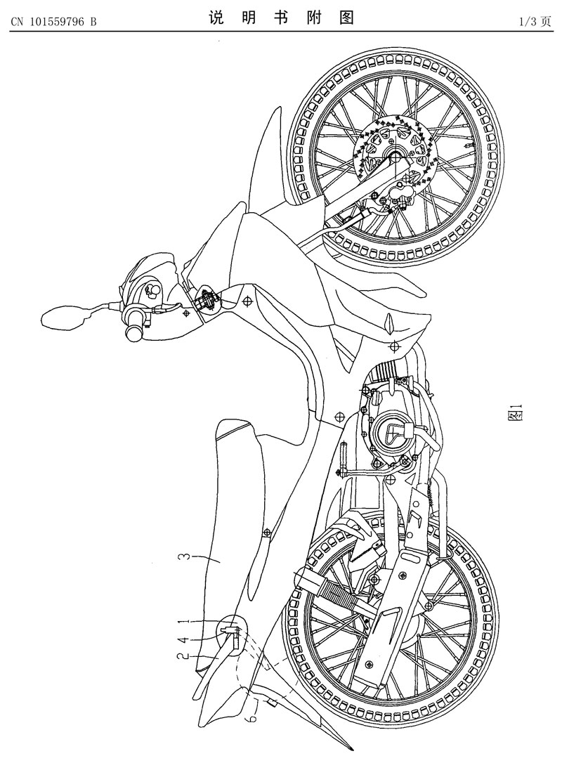 簡要說明: 本發明公開了一種摩托車頭盔防盜裝置,包括車架(1)、后扶手(2)和座墊(3),其中座墊(3)安裝在車架(1)的后部,后扶手(2)的前端通過兩個后扶手支耳(2a)固定于車架(1)的尾端,在所述后扶手支耳(2a)上固定有掛鉤(4),所述座墊(3)的后部將所述后扶手支耳(2a)及掛鉤(4)罩入其中。本發明在不占用置物箱空間的前提下,能方便摩托車頭盔及其它物品的臨時掛放,并且防盜效果良好,具有構思巧妙、結構簡單、實施容易等特點。