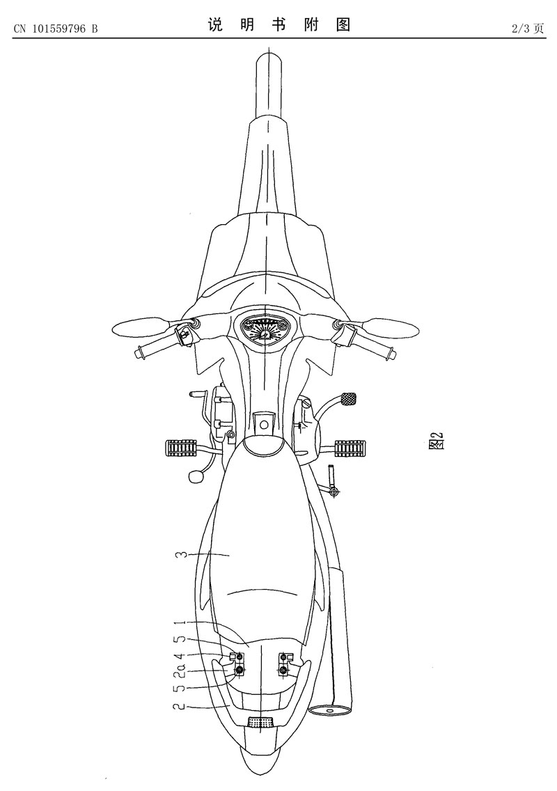 簡要說明: 本發明公開了一種摩托車頭盔防盜裝置,包括車架(1)、后扶手(2)和座墊(3),其中座墊(3)安裝在車架(1)的后部,后扶手(2)的前端通過兩個后扶手支耳(2a)固定于車架(1)的尾端,在所述后扶手支耳(2a)上固定有掛鉤(4),所述座墊(3)的后部將所述后扶手支耳(2a)及掛鉤(4)罩入其中。本發明在不占用置物箱空間的前提下,能方便摩托車頭盔及其它物品的臨時掛放,并且防盜效果良好,具有構思巧妙、結構簡單、實施容易等特點。