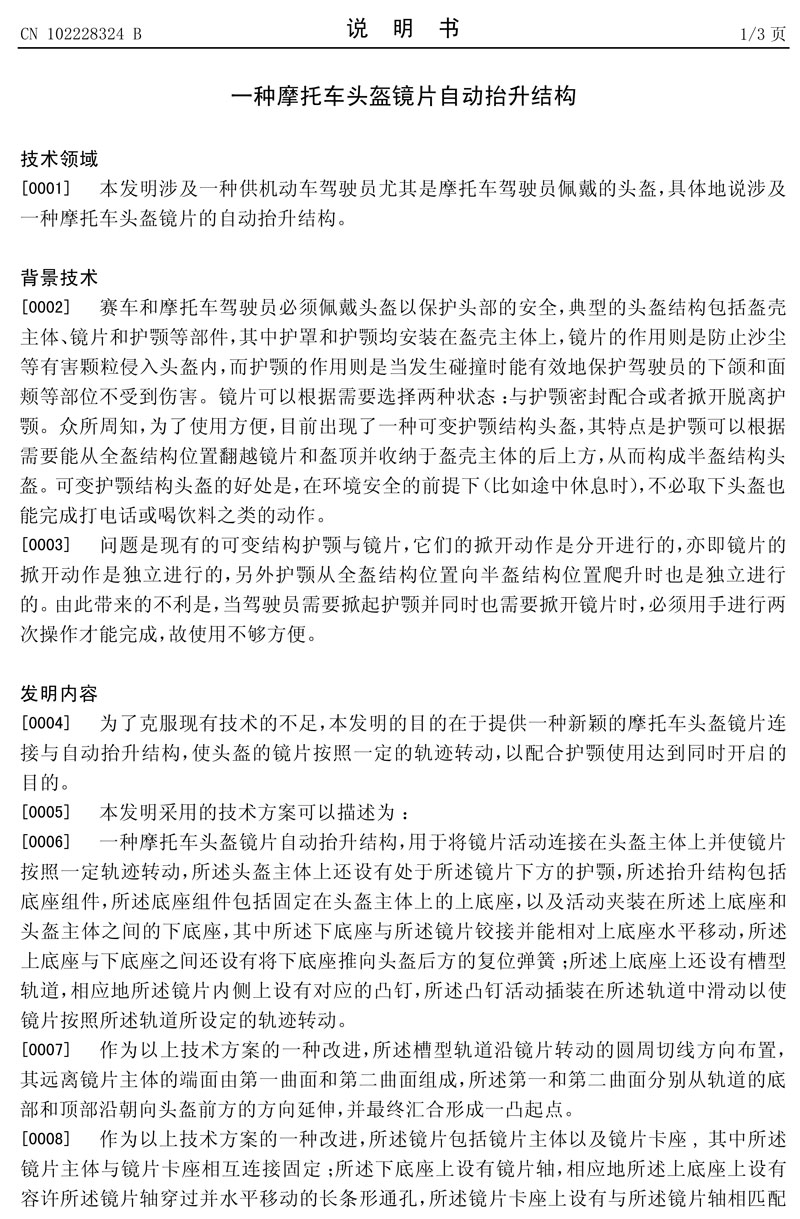 一種摩托車頭盔鏡片自動抬升結構發明專利