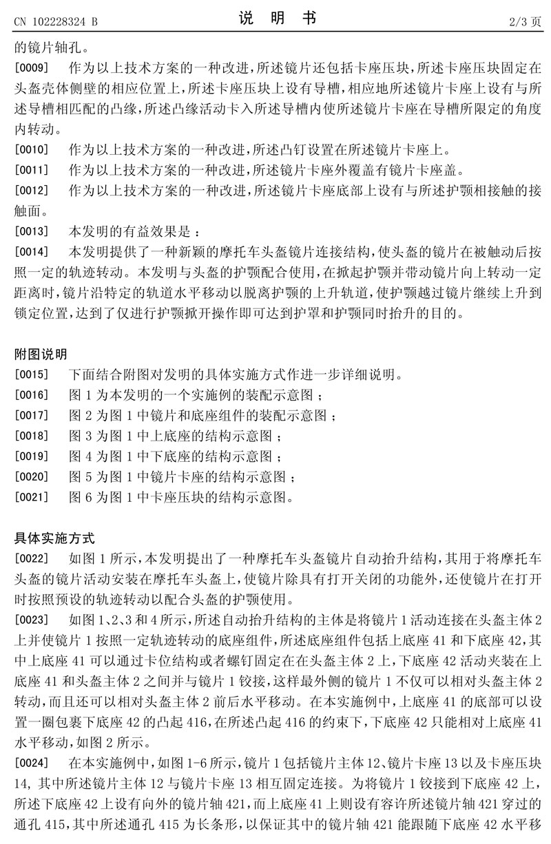簡要說明:本發明提出了一種摩托車頭盔鏡片連接結構,其包括固定在頭盔殼體上的上底座,以及與活動夾裝在所述上底座和頭盔主體之間的下底座,所述下底座與所述鏡片鉸接并能相對上底座水平移動;所述上底座上還設有槽型軌道,相應地所述鏡片上設有匹配的凸釘,所述凸釘活動插裝在所述軌道中滑動以使鏡片按照所述軌道所設定的軌跡轉動。本發明與護顎配合使用時,在掀起護顎觸動鏡片向上轉動一定距離時,鏡片沿特定的軌道水平移動以脫離護顎的上升軌道,使護顎能無障礙地越過鏡片繼續上升到鎖定位置,達到了僅進行護顎掀開操作即可達到護罩和護顎同時抬升的目的。