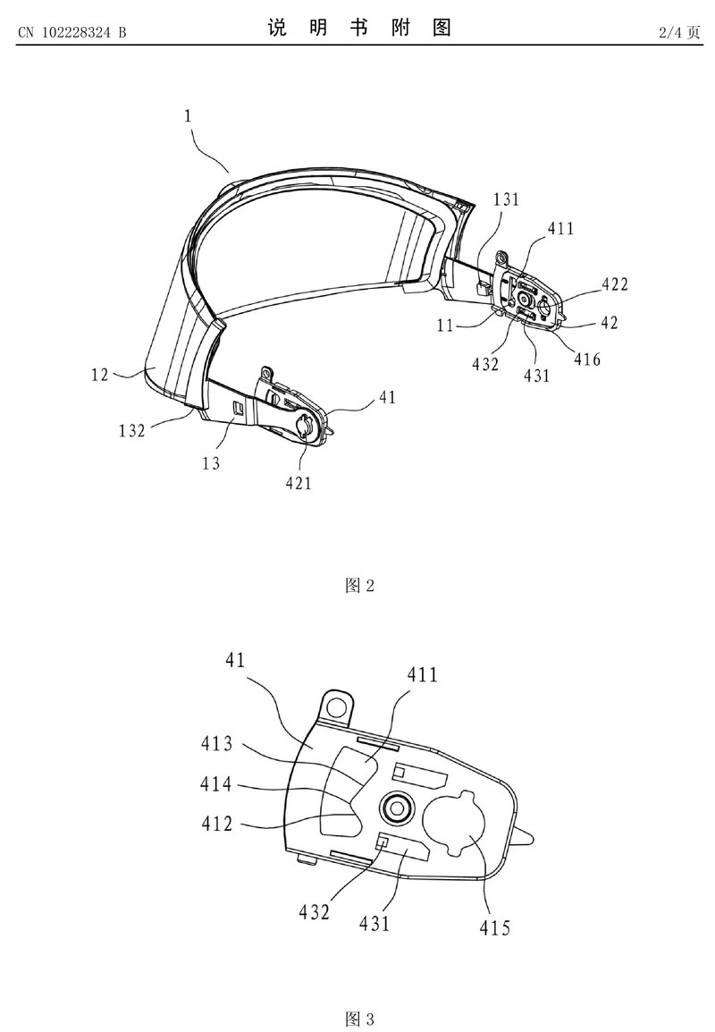 簡(jiǎn)要說(shuō)明:本發(fā)明提出了一種摩托車頭盔鏡片連接結(jié)構(gòu),其包括固定在頭盔殼體上的上底座,以及與活動(dòng)夾裝在所述上底座和頭盔主體之間的下底座,所述下底座與所述鏡片鉸接并能相對(duì)上底座水平移動(dòng);所述上底座上還設(shè)有槽型軌道,相應(yīng)地所述鏡片上設(shè)有匹配的凸釘,所述凸釘活動(dòng)插裝在所述軌道中滑動(dòng)以使鏡片按照所述軌道所設(shè)定的軌跡轉(zhuǎn)動(dòng)。本發(fā)明與護(hù)顎配合使用時(shí),在掀起護(hù)顎觸動(dòng)鏡片向上轉(zhuǎn)動(dòng)一定距離時(shí),鏡片沿特定的軌道水平移動(dòng)以脫離護(hù)顎的上升軌道,使護(hù)顎能無(wú)障礙地越過(guò)鏡片繼續(xù)上升到鎖定位置,達(dá)到了僅進(jìn)行護(hù)顎掀開操作即可達(dá)到護(hù)罩和護(hù)顎同時(shí)抬升的目的。 |
