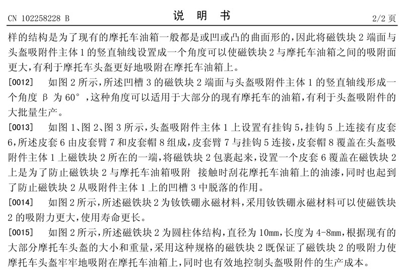 簡要說明:本發(fā)明提供一種頭盔吸附件,頭盔吸附件由柱形的頭盔吸附件主體和磁鐵 塊組成,所述頭盔吸附件主體下端設有凹槽,磁鐵塊安裝在凹槽內,磁鐵塊與 凹槽為緊密配合,頭盔吸附件主體上端設有卡槽,卡槽與摩托車頭盔邊緣相配 合,這種頭盔吸附件具有加工生產方便、吸附效果好、能靈活安裝在摩托車頭 盔上的頭盔吸附件的特點。 |